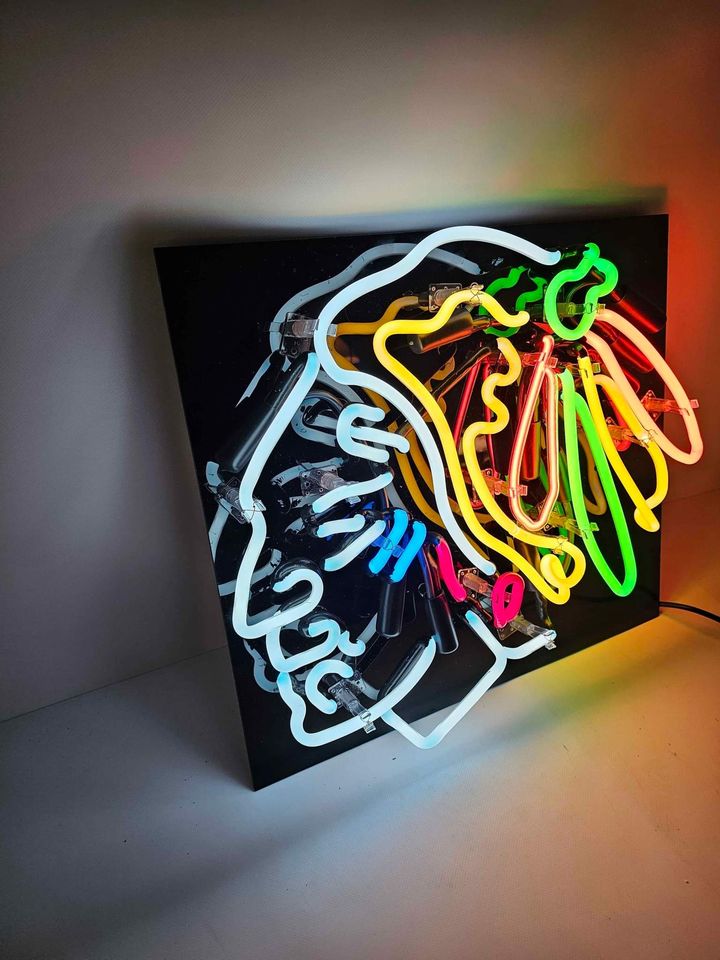This Chicago Blackhawks neon sign celebrates the city’s legendary hockey legacy in brilliant light. Featuring the team’s iconic logo illuminated in bold red, white, and black tubing, this sign brings instant game-day energy to any space. Whether you’re creating a bar setup, man cave, or nostalgic Chicago display, it’s a glowing tribute to hometown pride.