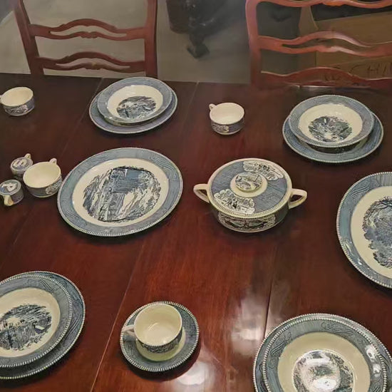 Bring timeless charm to your table with this vintage blue and white transferware dinner set, featuring classic pastoral winter scenes inspired by Currier & Ives and early American countryside motifs.