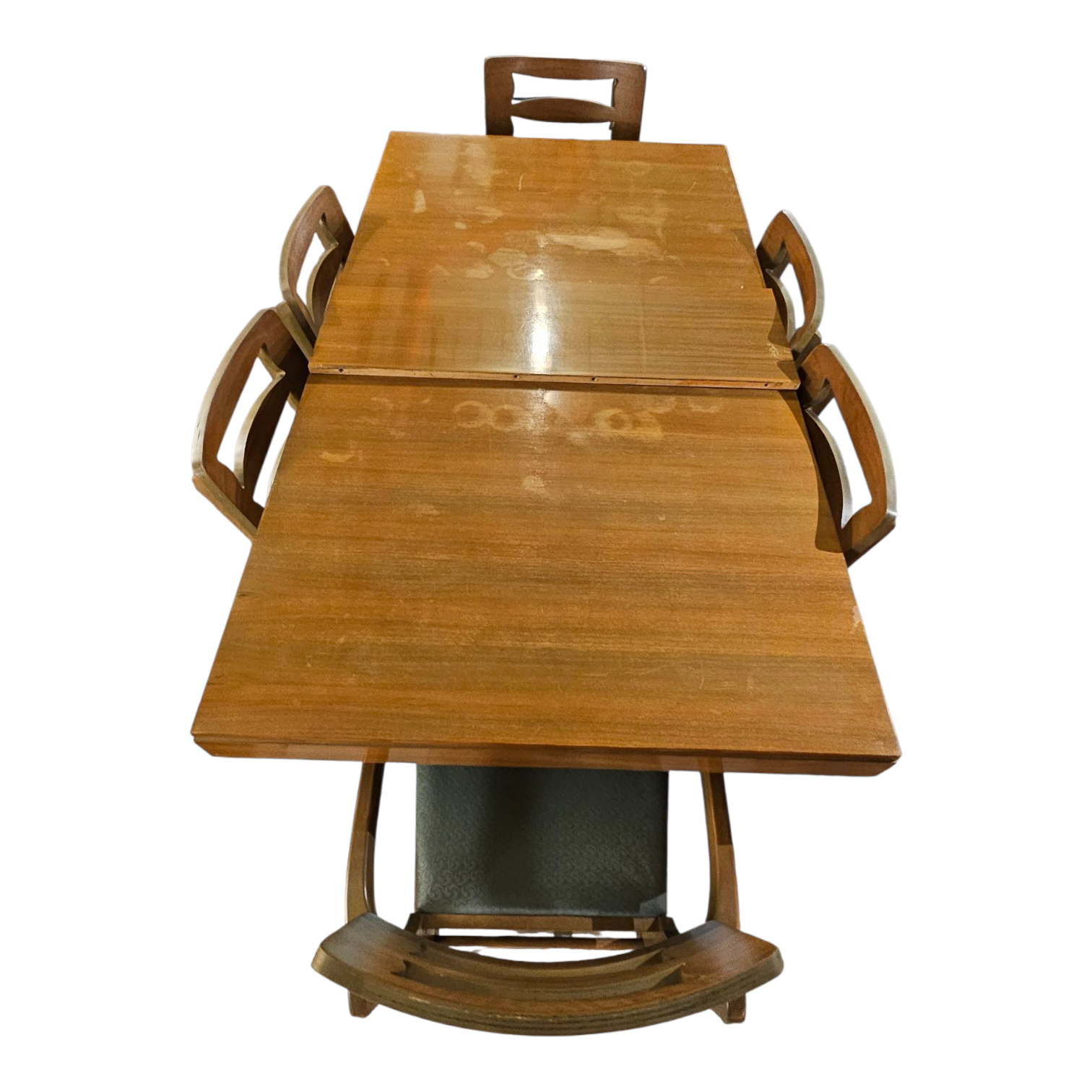 Ideal for family gatherings, dinner parties, or retro-themed interiors, the set offers generous seating and a sleek, understated silhouette. The table’s warm finish and the chairs’ gently curved backs create a comfortable, stylish space for meals and conversation.