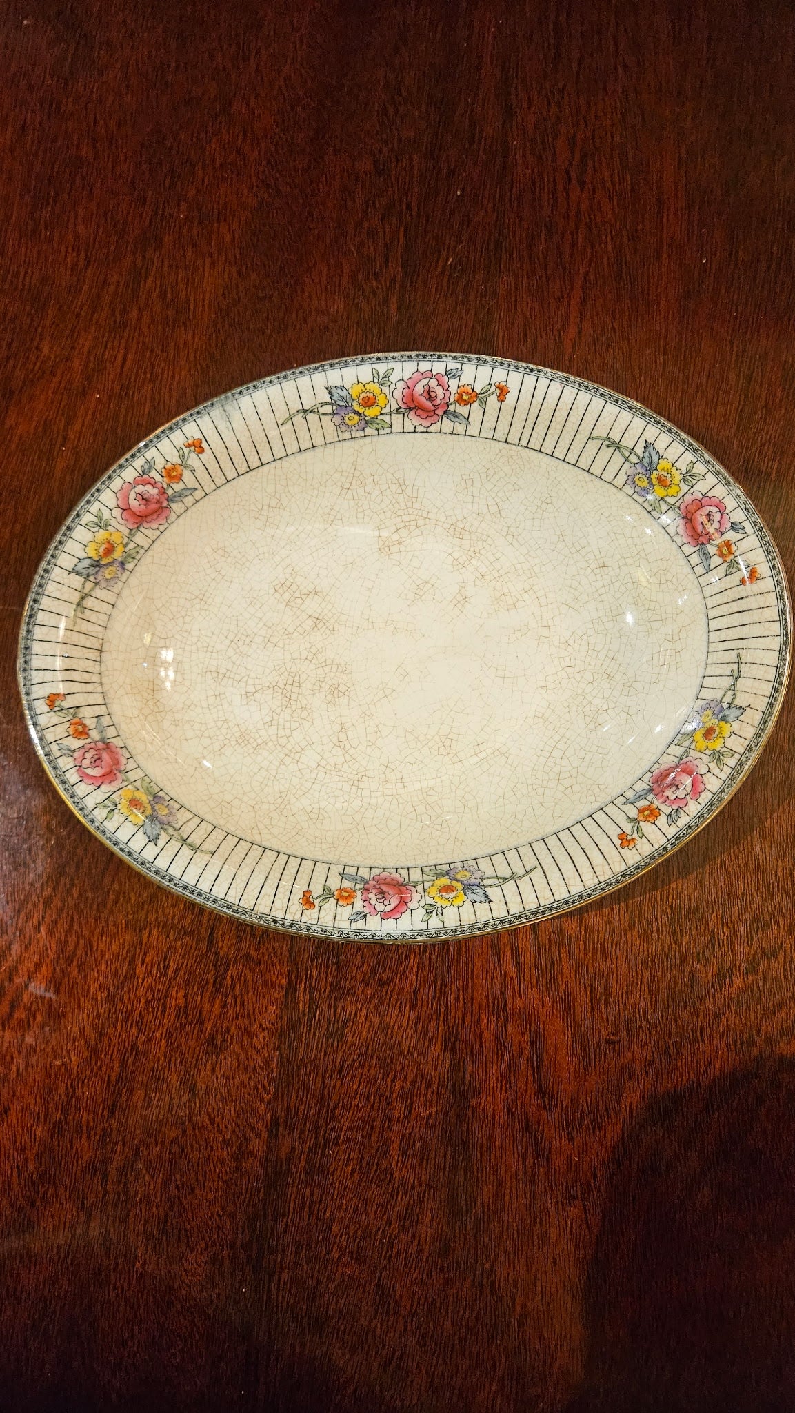 The pattern is unmistakably Edwardian: a striped border with hand-touched florals, delicate linework, and subtle crazing that only true antiques collect over a century. Each piece feels lovingly weathered — the good kind — with enough charm to elevate weeknight dinners or add instant personality to a styled photoshoot.