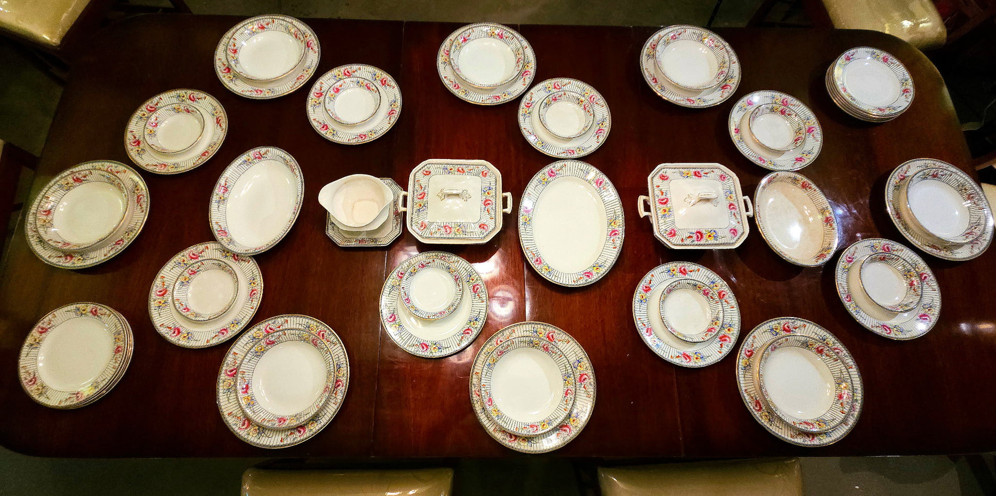 This is a complete, hard-to-find set with serving pieces: oval platters, shallow bowls, soup plates, side plates, and two rare octagonal covered dishes plus a matching gravy boat. Perfect for hosting, gifting, or starring in a period film.