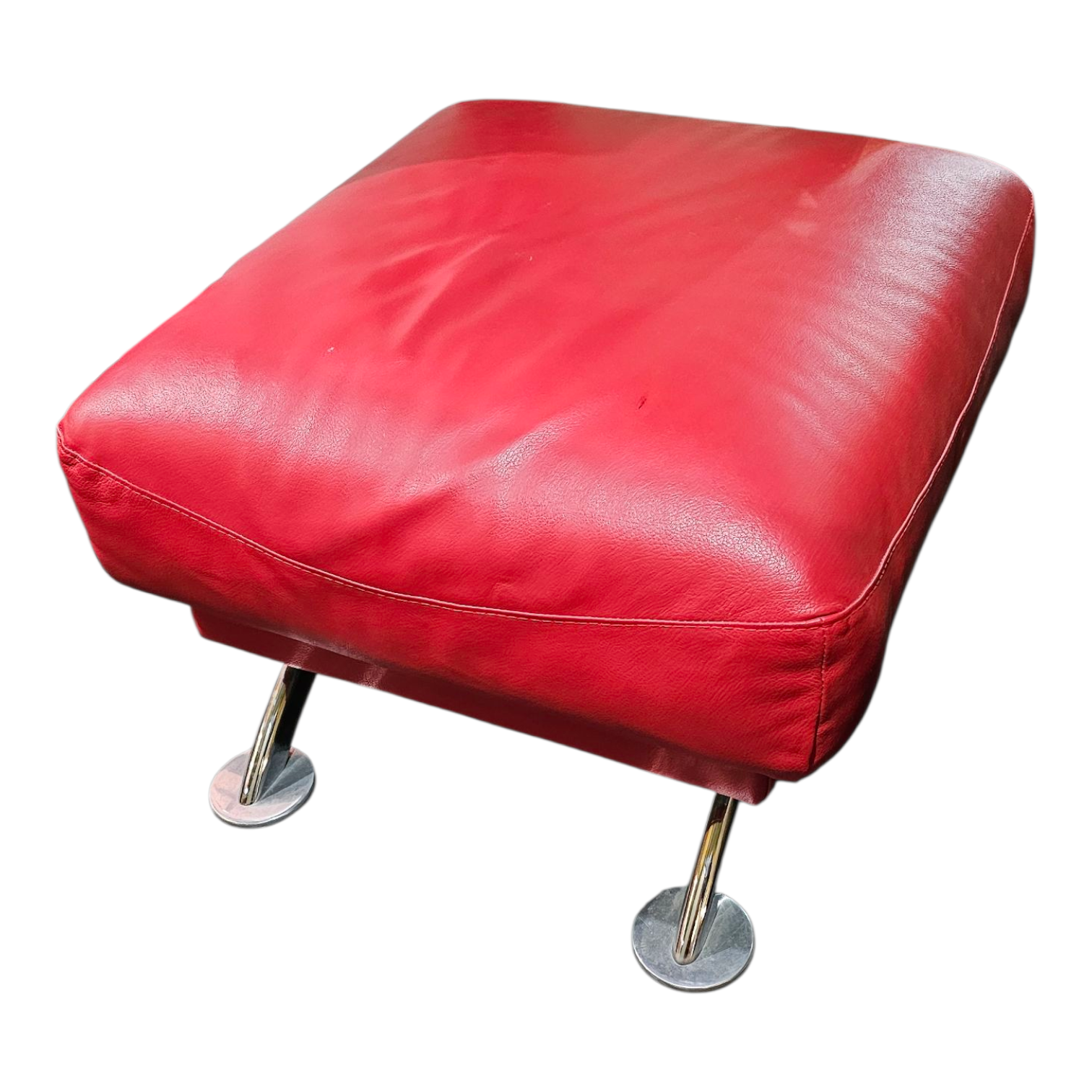 Red Leather Ottoman with Chrome Disc Feet