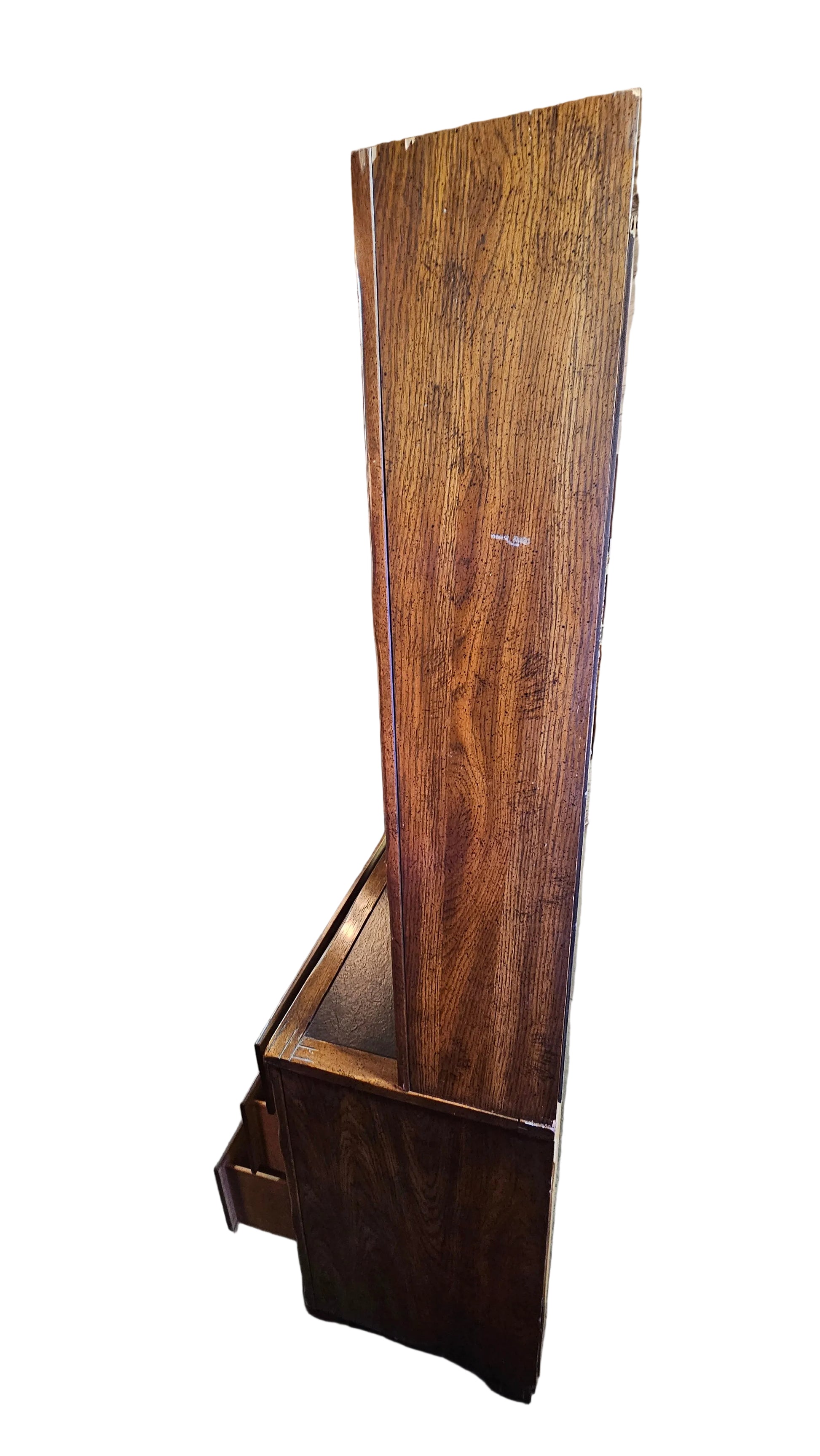 The upper shelves are perfect for displaying books, pottery, barware, or collected objects, while the lower drawers offer generous concealed storage for linens, office supplies, or everyday essentials. Subtle wear throughout the wood adds depth and authenticity, giving this hutch the quiet confidence of a piece that was made to be used and appreciated over time.
