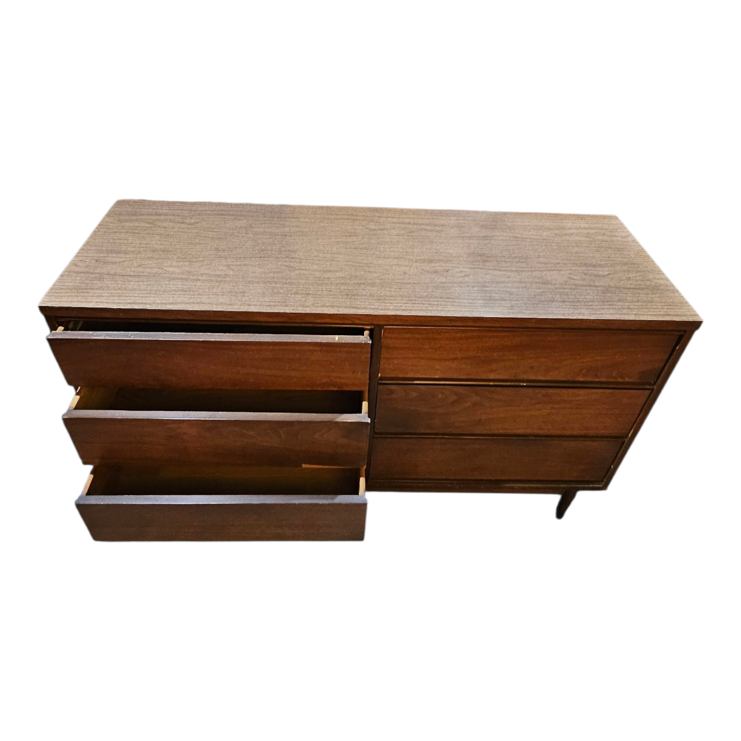This classic mid-century modern walnut dresser is a study in clean lines, warm wood tones, and functional design. Featuring a long, low silhouette with tapered legs and smooth drawer fronts, it reflects the timeless craftsmanship and understated elegance that define mid-century furniture. The rich walnut veneer showcases beautiful natural grain, while the streamlined form keeps the piece versatile and visually light.